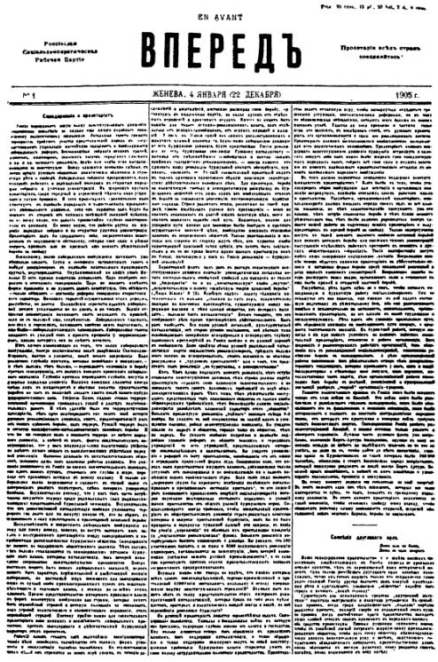 Первая страница большевистской газеты «Вперед» № 1, 4 января 1905 г. (22 декабря 1904 г.) с передовой статьей В. И. Ленина «Самодержавие и пролетариат» Уменьшено